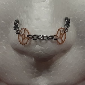 (73mm), 3" We hope this guide has been helpful and informative! [2], https://en.wikipedia.org/w/index.php?title=Nose_chain&oldid=1090231446, Creative Commons Attribution-ShareAlike License 3.0, This page was last edited on 28 May 2022, at 07:21. . Gauge - Measure the size of the plug across the middle. A nose chain is a type of facial jewelry that originated centuries ago as a part of women's fashion in India. Get A Mystery Coupon Immediately! (22mm), 15/16" What you shouldnt feel are fever, swollen and tender skin, and pus coming out of the piercing site. Ointments, on the other hand, prevent oxygen from reaching your piercing and leave a sticky residue that could clog up your hole. Just Answer 5 Easy Questions, If you've got multiple nose piercings and are looking for brand new body jewelry then check out this 20 gauge double nose bone chain jewelry that you can wear in your multiple nostril piercings. (67mm), 2-3/4"