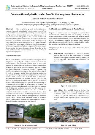 "\n" . Rather, he is making it available to municipalities to tackle the mounting waste plastic piles. Plastics dumped on land too break down into tiny pieces and are washed down water courses into rivers, lakes and seas. e) Microplastics Putting the plastics in roads does not make plastics disappear.