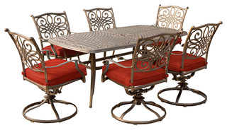 But we hope you decide to come check us out. Please visit the, Traditions Seven Piece Aluminum Outdoor Dining Set with Swivel Rocking Chairs, FREE Standard Ground Shipping on Orders over $49, Constructed from aluminum with removable olefin cushions, Traditional style is sure to nicely complement any existing outdoor decor or furniture, All weather construction will protect against rust and fading year round, Includes a hole in the center of the table, making it incredibly easy to add an umbrella, Chairs swivel 360 degrees and provide a gentle rocking motion, Comes with a 1 year limited manufacturer warranty, Swivel Rocking Chair - 36.22"H x 25.39"W x 25.79"D. Outdoor Dining Set w/4 Dining Chairs, 2 Swivel Chairs & Table, Bill or Ship Write a Product Review. For more information go to http://www.P65Warnings.ca.gov. Each piece features alumnicast frames with heavily gauge aluminum-alloy extrusions and uniquely supported inner walls. These frames will remain rust free for life. Find answers in product info, Q&As, reviews. Please try your search again later. Enjoy the peace-of-mind knowing the materials are treated to resist weather, rust and UV fading throughout the years, making this a quality dining set to have as the centerpiece of your backyard or patio. Please enter Order/PO Number and postal code. Furniture Return Policy, On purchases of $500 for 6 months, or $1,000 for 12 months made with your Build.com Credit Card, Customer service wait times and delivery schedules may be impacted. x 72-In. If you have questions about Hanover part # TRADITIONS7PCSW-6 or any other product for sale, our customer service team is eager to help.
