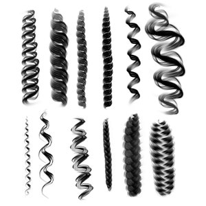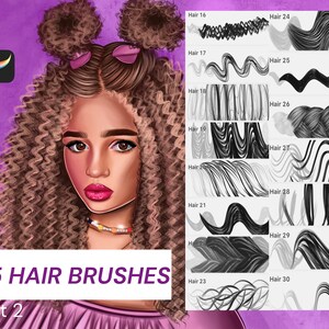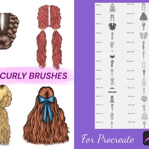 Hair Brushes for Procreate. Firstly, this set of 25 Procreate Curls. It includes a realistic hair brush collection perfect for human portraits or fashion sketches.
